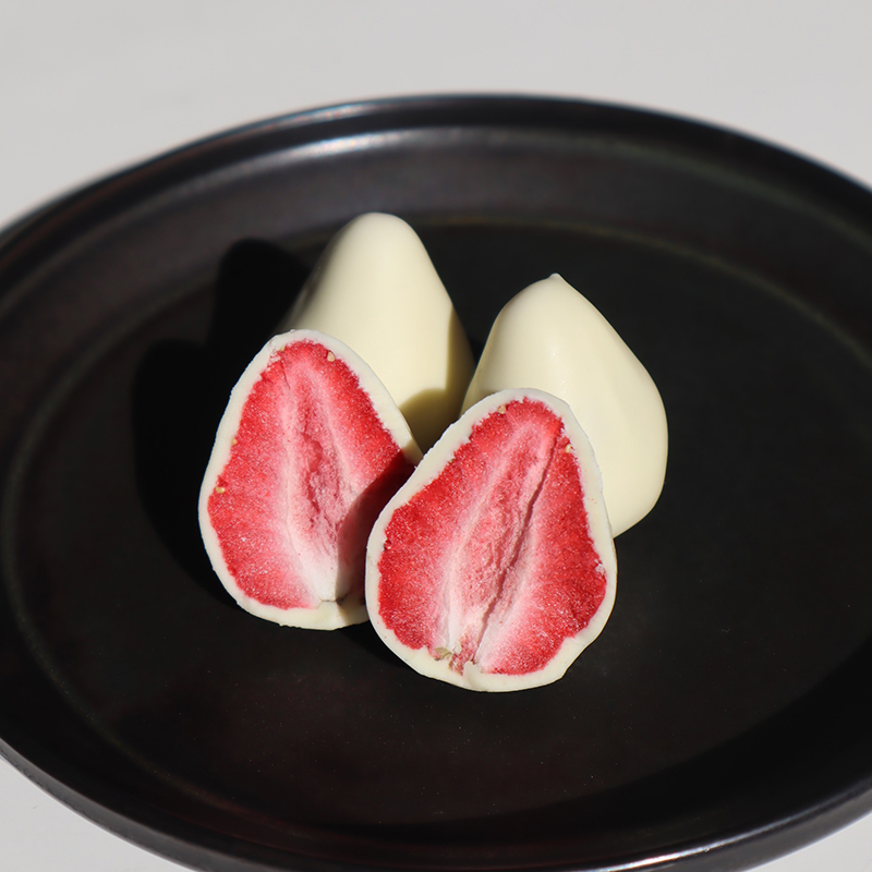 カカオバター・全粉乳・オーガニックシュガーのみで作り上げた、カカオ研究所オリジナルの無添加ホワイトチョコレートです。あっさりとしていながらミルキーな余韻を残し、苺の香りを引き立てます。