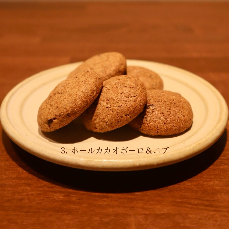 和菓子の“ボーロ”の製法をベースに、カカオニブ・ハスク(殻)・胚芽、カカオの全てを“まるごと”練り込んだホール仕立てです。固めのクセになる食感で、噛みしめるほど力強い香ばしさが弾けます。