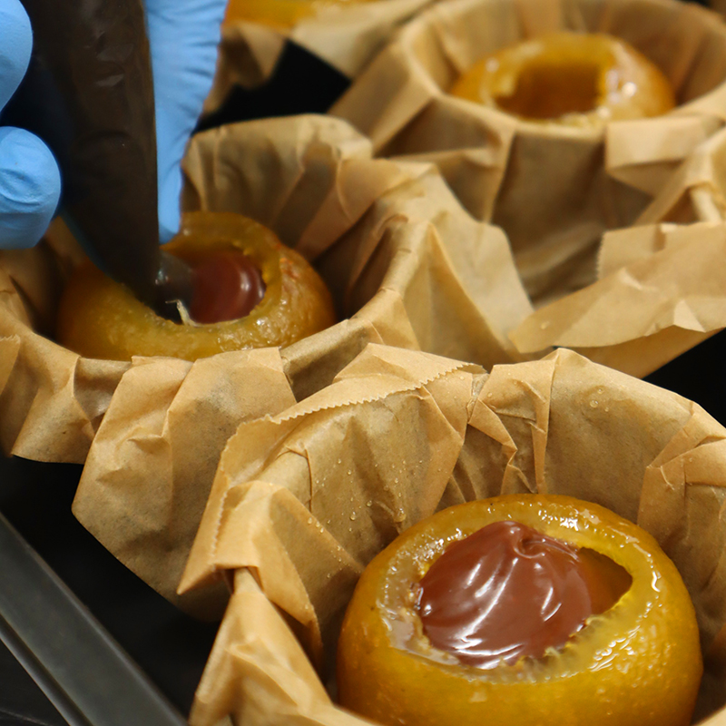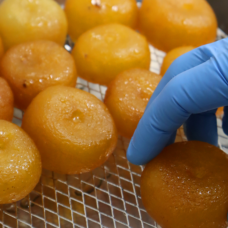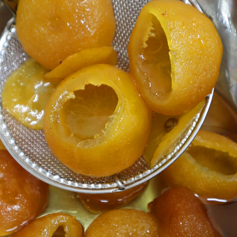 一つひとつ丁寧に中身をくり抜いた柚子を蜜漬けし、器として使用。